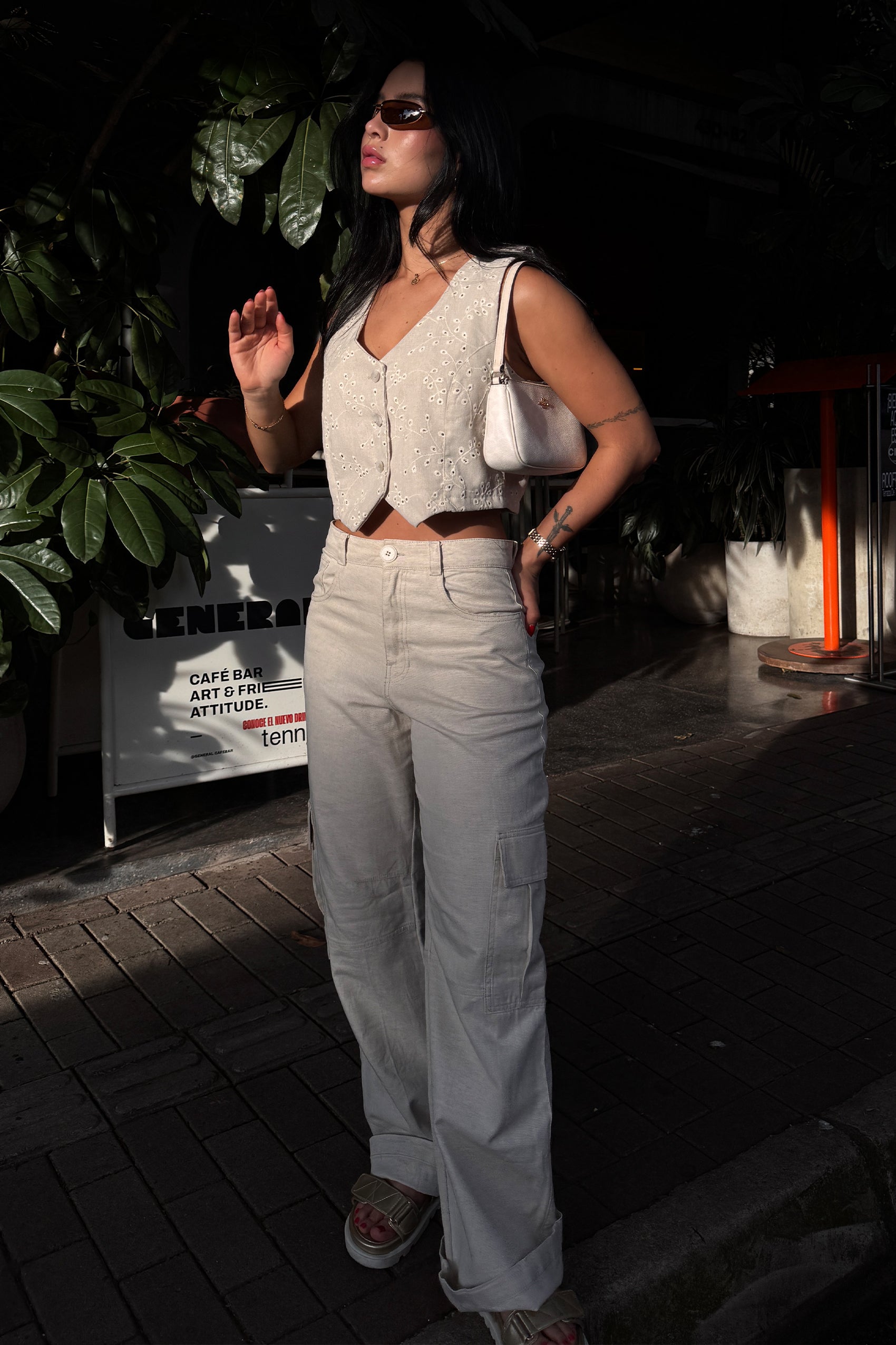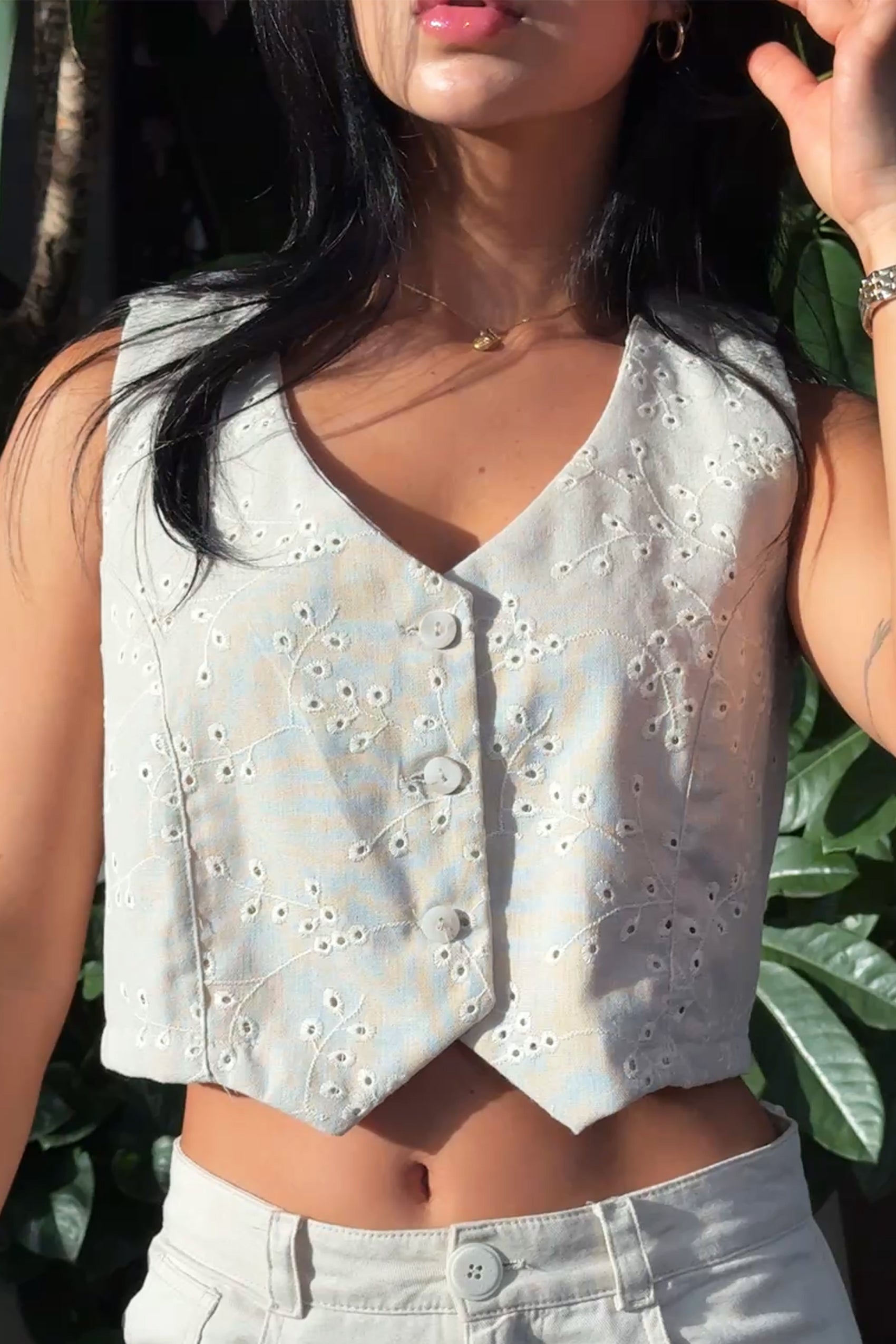 CHALECO CORTO EN TELA OJALILLO CON BOTONES